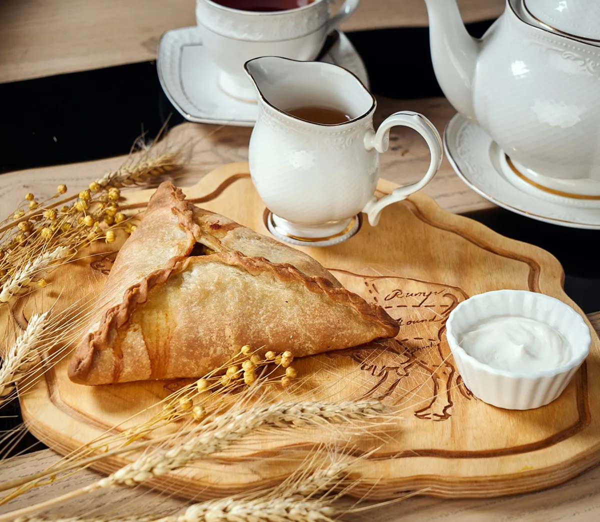 Татарский очпочмак - треугольник, как символ семьи: отец, мать, ребенок - появился во времена, когда тюркские племена вели кочевный образ жизни, и зачастую использовали лишь конину из мяса и мелко нарубленный картофель в качестве начинки. Однако ханам, в дань уважения, подавали треугольник, который сочетал в себе несколько видов мяса, такие как баранина, говядина и дичь. Авторское видение нашего шефа предполагает устоявшиеся традиции татарского народа, поэтому в составе нашего треугольника говядина - для насыщения, утка - для пикантности, и конечно же картофель. Подается с наваристым бульоном, каймаком и зеленью.