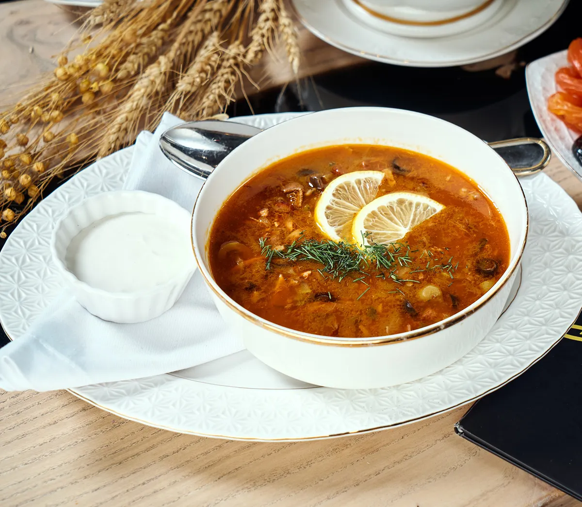 Солянка - это густой и соленый суп, который эволюционировал из крестьянской похлебки в ресторанное насыщенное блюдо с обилием мяса, копченостей. Наша солянка идет по рецепту Юнуса Ахметзянова - известного татарского кулинара, по задумке которого пряность в супе достигается путем копчения чернослива и наваристого мясного бульона с добавлением нескольких видов мяса (говядина, утка, конина, курица) и традиционных соленостей.