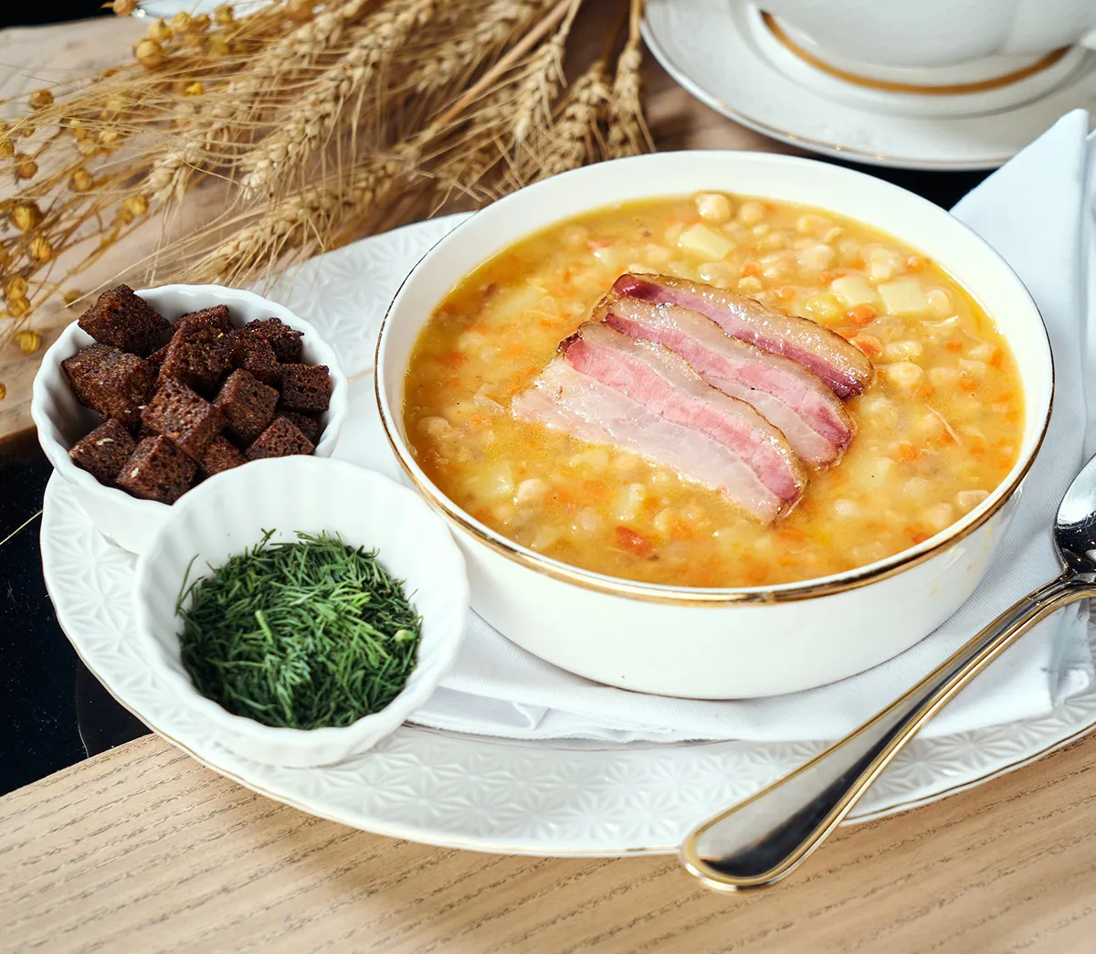 История горохового супа начинается с эры викингов, Скандинавии, а после перекочевал в Древнюю Русь. Идеальное похмельное блюдо быстро обросло популярностью своим незамысловатым рецептом. Однако татары пошли дальше, и усовершенствовали рецепт за счет добавления копченой конины, сделав его еще более питательным. В нашей интерпретации суп идет на основе костного бульона, с копченой кониной и бородинским гренками.