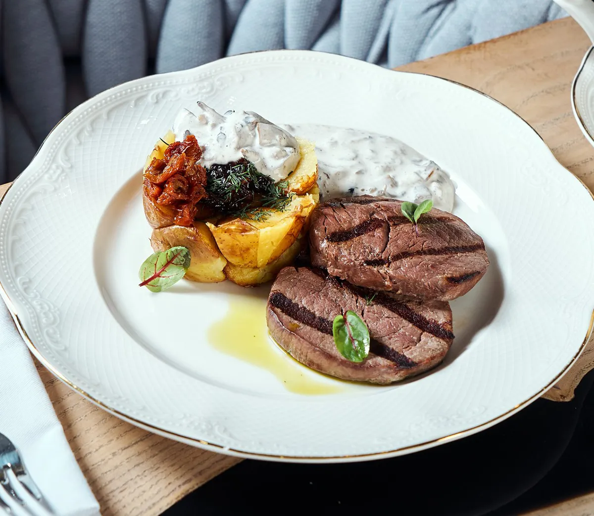 Вырезка конины, картофель бейби, каймак, вяленые томаты, карамелизованный лук, грибной соус