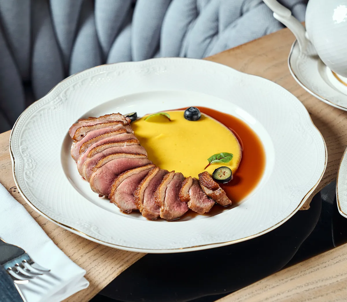 Изысканный французский деликатес не мог пройти мимо традиций и татарского народа. Ведь дичь считалась самым обиходным промыслом в кулинарии, на стол молодоженам обязательно ставили и гуся, и утку - как знак семейного благополучия. Наш шеф решил поэкспериментировать и соединил рецепты французской, русской и китайской кухонь, приправил локальными специями для придания национальных оттенков.